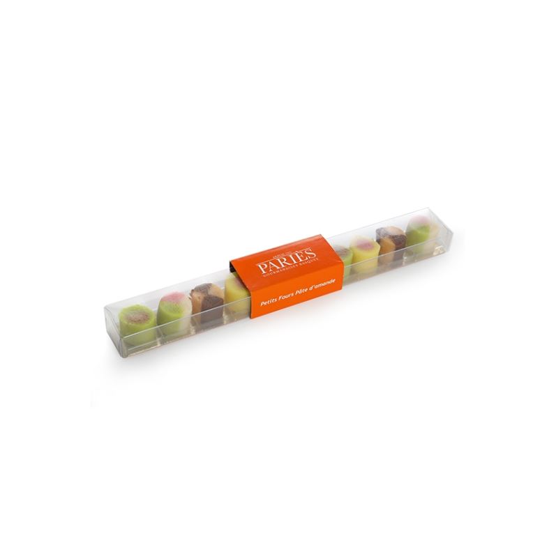 Gama de pastas de mazapán: café con almendras, cerezas almendras, frambuesa limón, praliné pistacho, chocolate de naranja, almendra pistacho, frambuesa almendra pistacho, frambuesa almendra, avellana chocolate, almendra chocolate