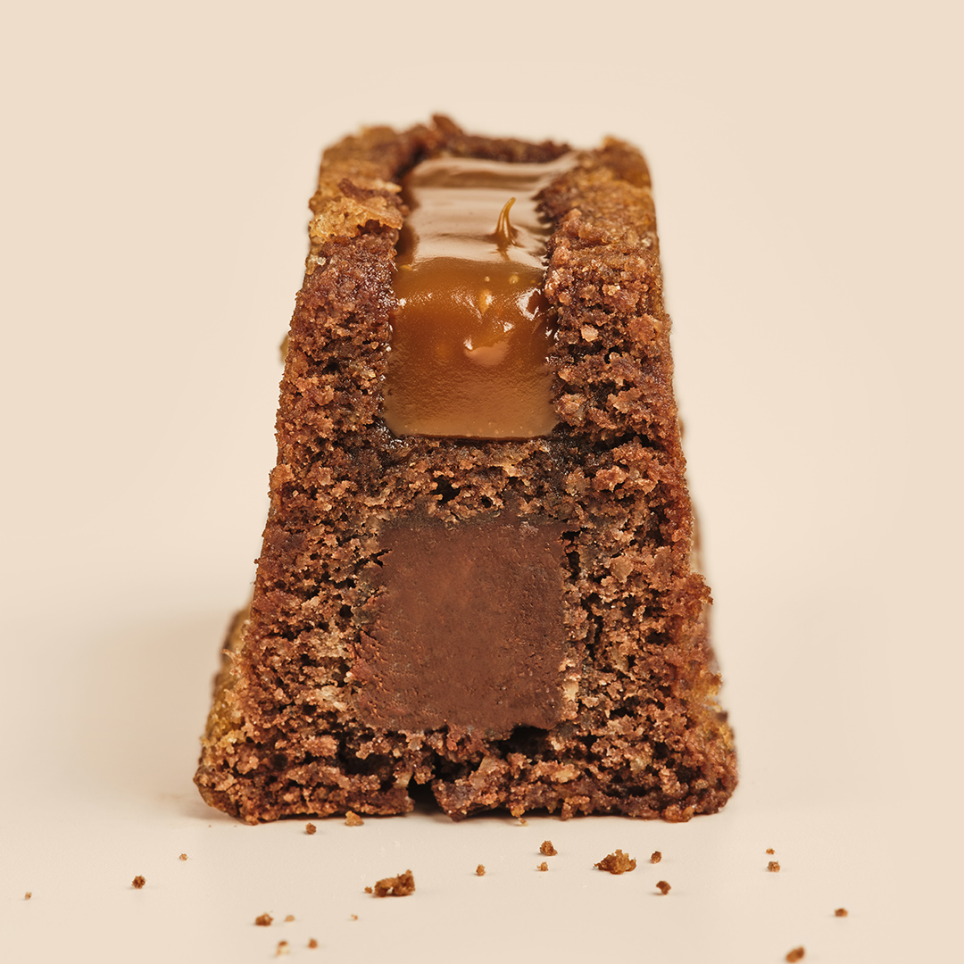 Galleta de chocolate, ganache de chocolate, caramelo de mantequilla salada.