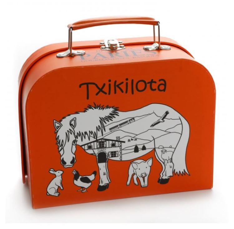 Caja de cartón Txikilota®, dimensión 20 cm x 15 cm, altura sin asa. Mango de metal.