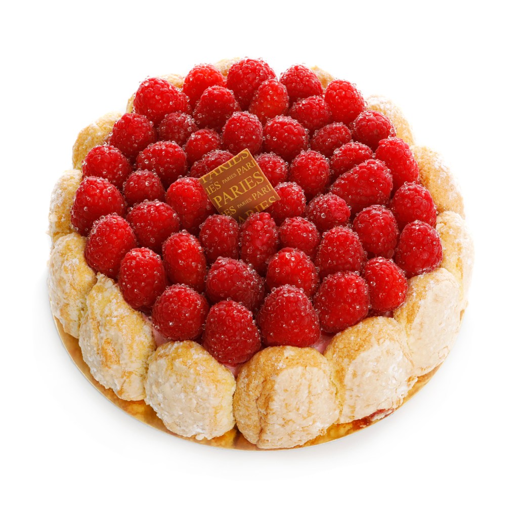 Bizcocho bizcocho, mousse de frambuesa, vainilla cremosa con frambuesas enteras.