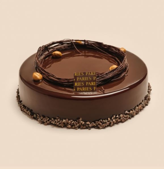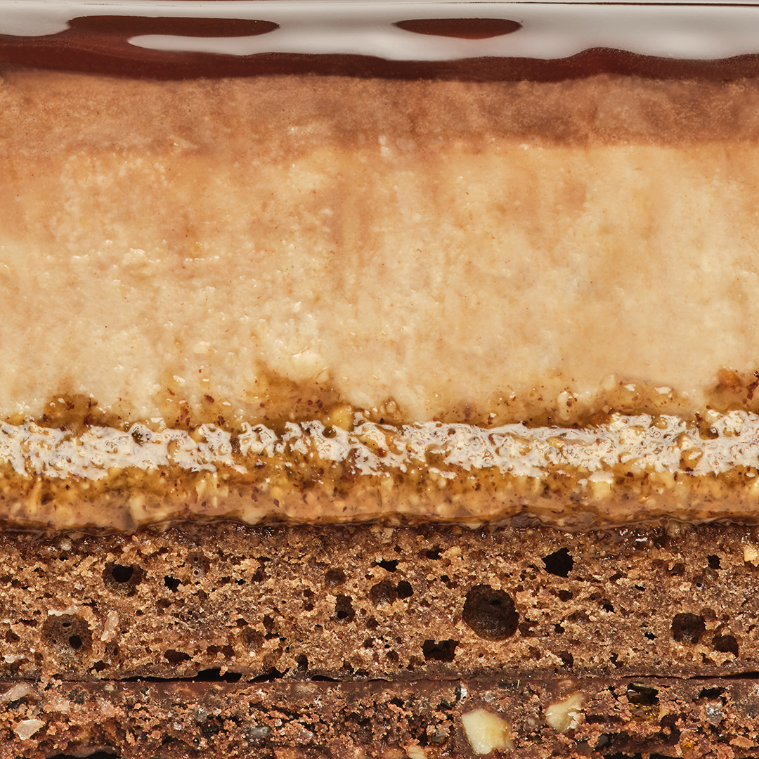 Galleta de cacao reconstituido, galleta de cacao blando, crema de avena, praliné casero de avellanas del Piamonte y mousse de chocolate negro 63% y chocolate con leche 45%.