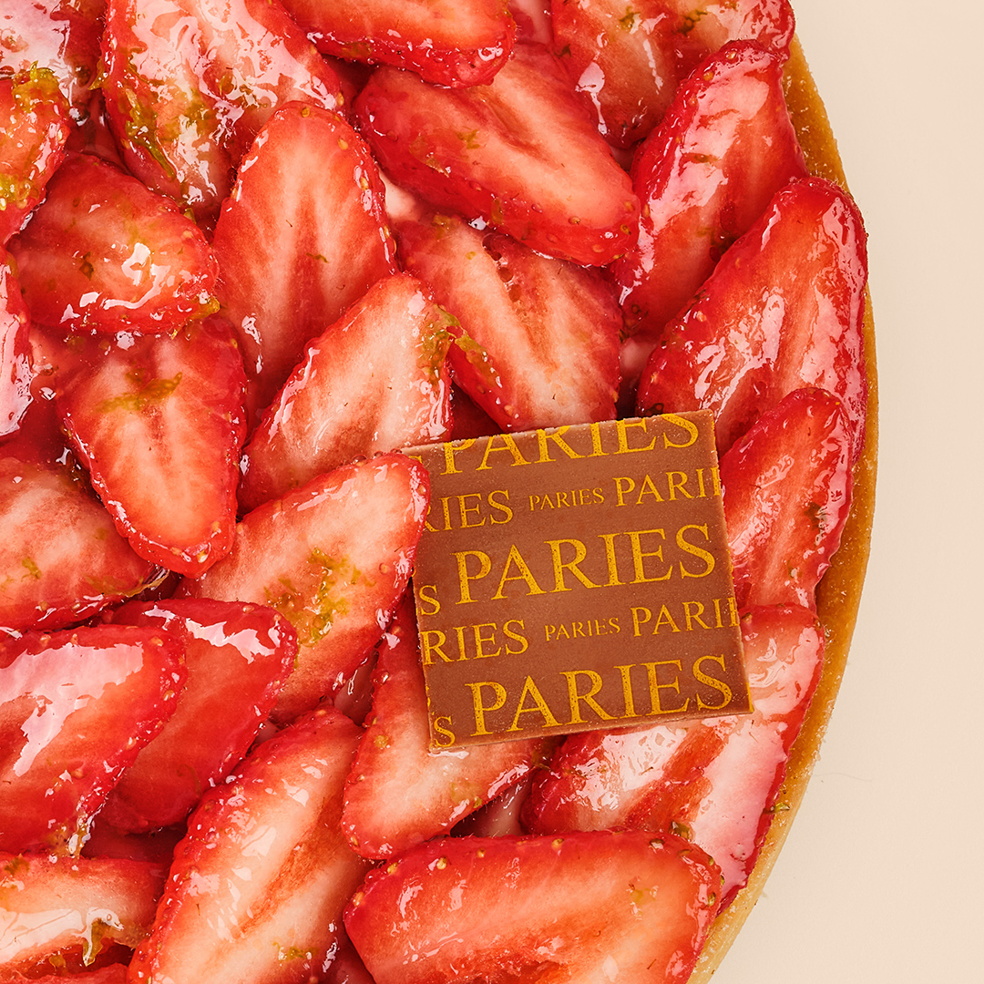 Base de tarta de almendras dulces, crema de almendras, crema diplomada de vainilla de Madagascar, fresas confitadas, gariguette de fresas del Sur-Oeste, ralladura de lima.