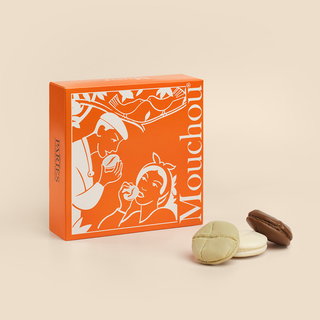 Ingredientes de surtido de Mouchou®: almendras, azúcar, clara de huevo , estabilizador: sorbitol, pistachos, 100% de masa de cacao, avellanas, extracto de café, sabor natural a vainilla, colorantes: caramelo negro, curcumina, indigotina.