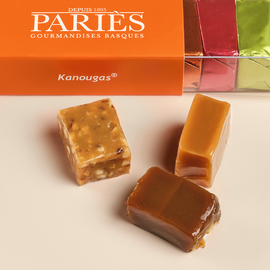 La especialidad más antigua de Maison Pariès es una creación del chocolatero Jacques Damestoy. Suntuosamente enriquecido con nueces o avellanas, aromatizado con café y vainilla, el kanouga es en sí mismo un mundo de sutileza. Fue bautizado por la prensa de Nueva York “Mejor caramelo del mundo”.