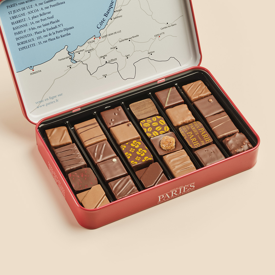 Ingredientes: azúcar, granos de cacao, 100% de masa de cacao, crema de leche, avellanas, almendras, manteca de cacao, cáscaras de frutas confitadas, leche en polvo, mantequilla, jarabe de azúcar invertido, chips de galletas (harina de trigo, extracto de malta de cebada), jarabe de glucosa, concentrado entero de leche, pistachos, pasta de pistacho, mantequilla salada, coco rallado, miel, café, canela, flores de té azul, agua de azahar, vainas de vainilla, Pimentón de Espelette, sabor natural de vainilla, infusión de tonka, estabilizador: sorbitol, emulsionante: lecitina de soja no transgénica, colores: curcumina, indigotina.