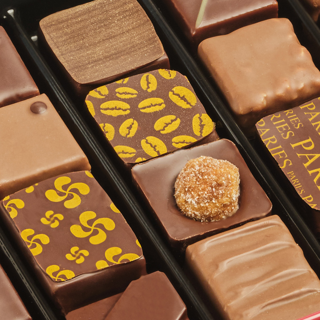 Elija una variedad de bombones de chocolate rellenos de acuerdo con sus preferencias: todos de chocolate con leche, o todos de chocolate negro, o déjese tentar por una mezcla de chocolate con leche/negro seleccionada por nosotros.