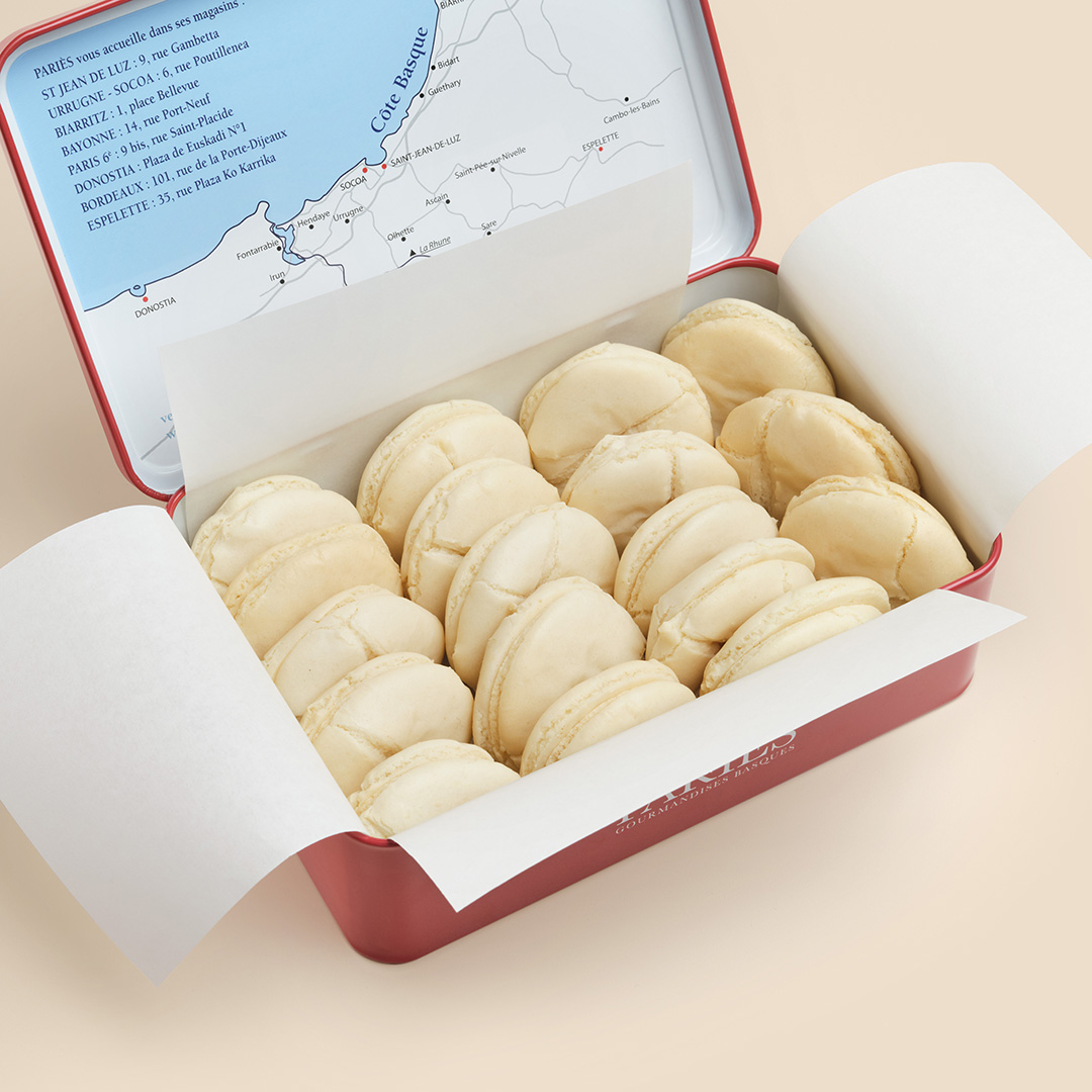 Una hábil mezcla de polvo fino de almendras Marconas, azúcar y clara de huevo. Básico (almendra) o también de: café, chocolate, pistacho o avellanas.