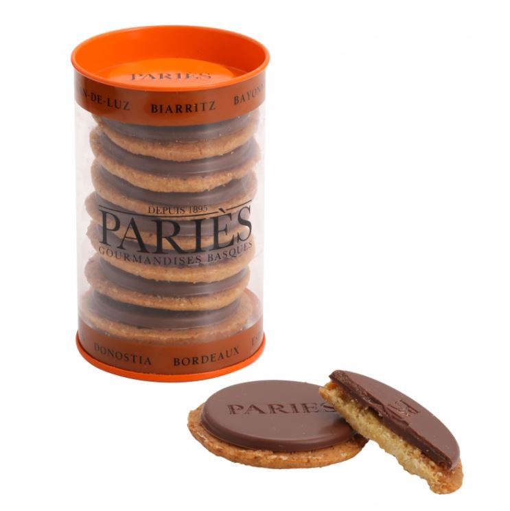 Cilindro de 7 galletas de mantequilla simples con disco de chocolate negro o con leche.