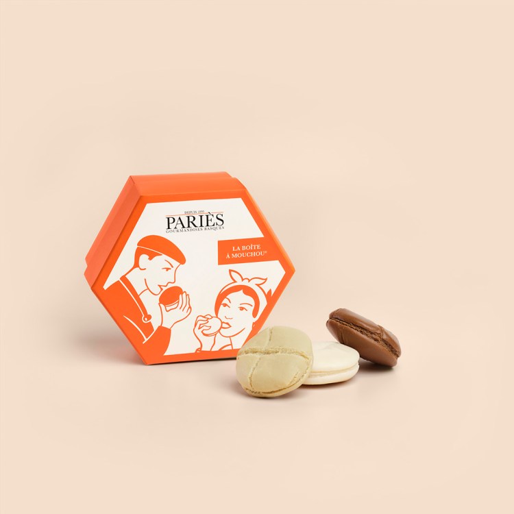 Mouchou ® y Macarons son dulces suaves sin conservantes a base de almendras trituradas. Le Mouchou ®, Musu ®, Muxu ®: una especialidad exclusiva de Maison Pariès, se compone de dos partes redondas bien unidas, con un corazón suave rico en excelentes almendras dulces «Marconas» de Cataluña y bajo en azúcar. Su nombre significa «beso» en euskera. Disfruta de los 5 sabores: básico (almendra), chocolate, avellana, café y pistacho.