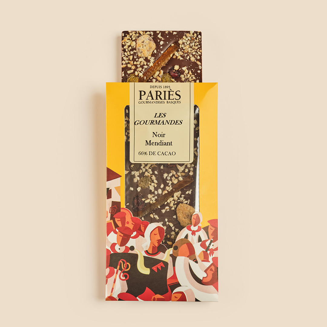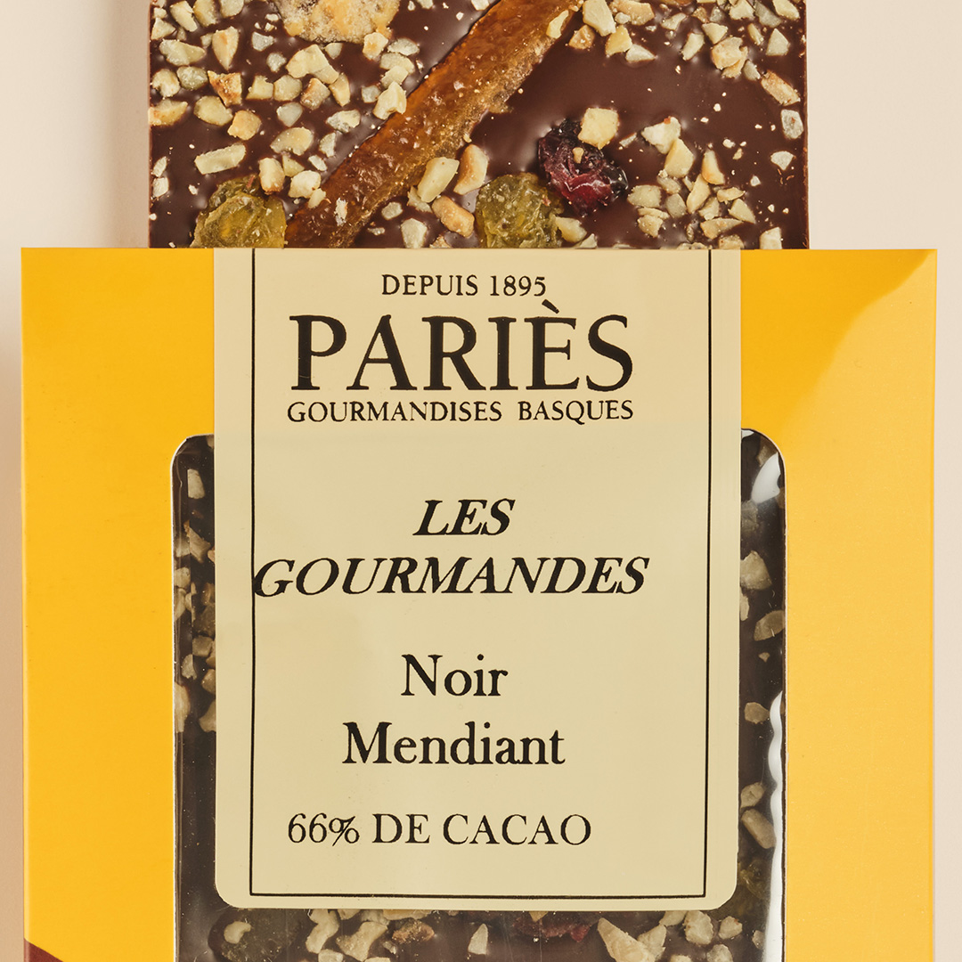 Ingredientes : Pasta de cacao, azúcar, manteca de cacao, arándanos, avellanas, pasas rubias, piel de naranja, jarabe de glucosa, almendras, pimiento de Espelette, emulgente: lecitina de soja no OMG.