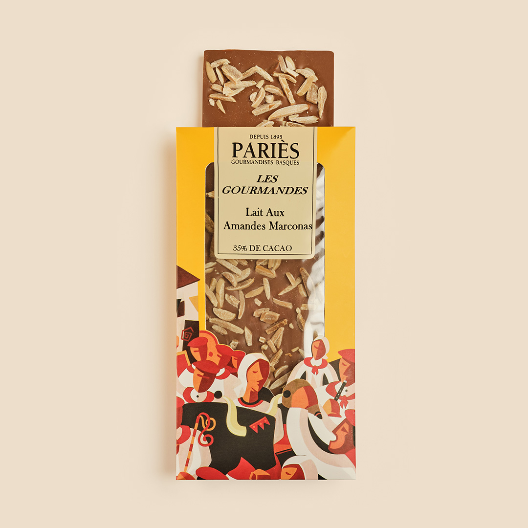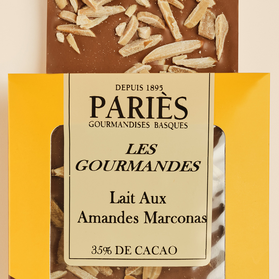 Esta barra de manteca de cacao pura combina la suavidad y la untuosidad del chocolate con leche con generosas láminas de almendras marconas (pequeñas almendras dulces y afrutadas).