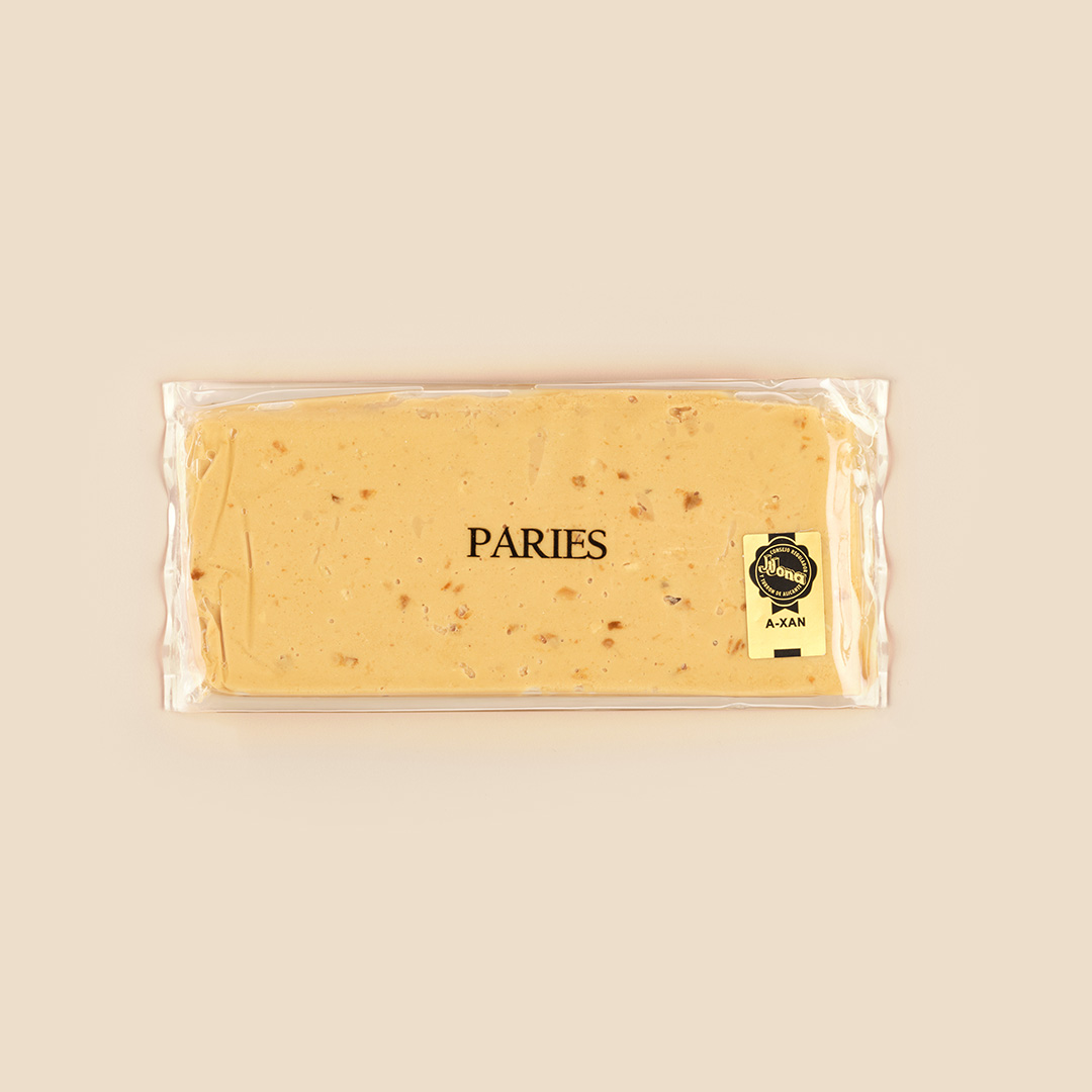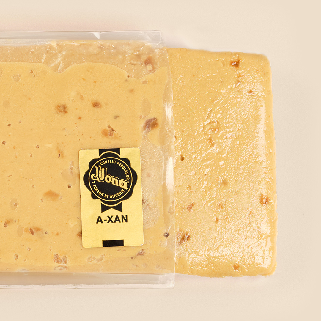 El turrón blando de Jijona (Indicación Geográfica Protegida) se funde a la perfección y se adorna con trocitos de almendra crujiente para mayor deleite.